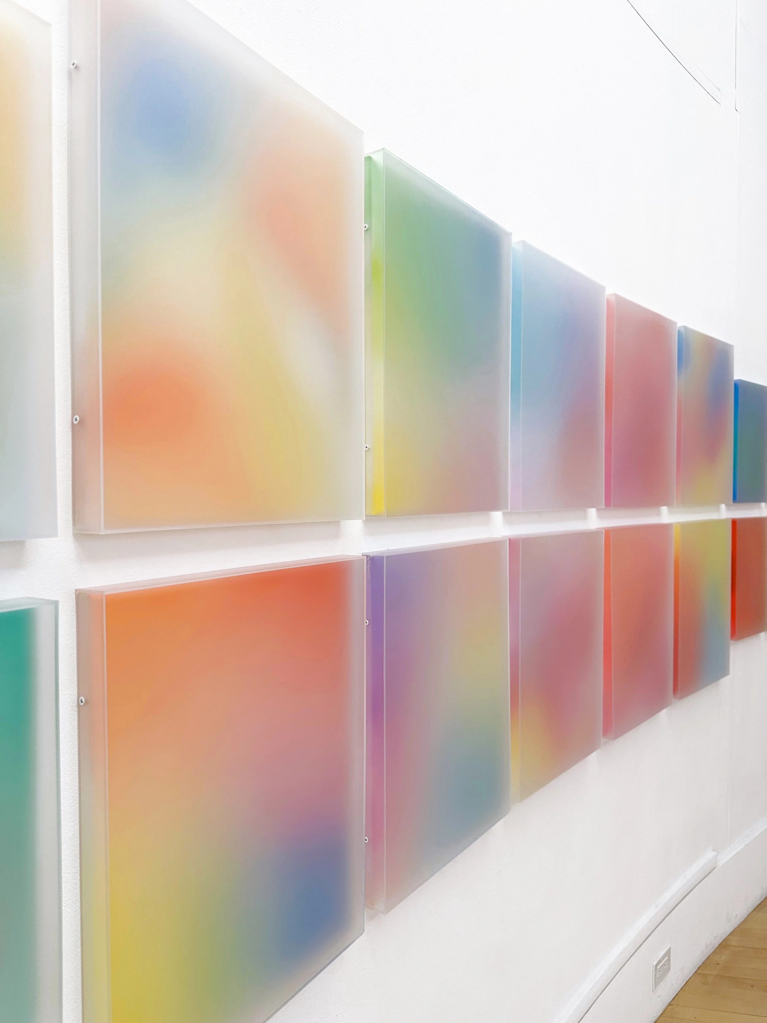 Chroma Clusters, airbrush, mylar, plexiglass frame, 2022
